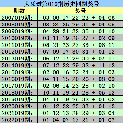 1、历史上大乐透第019期开出了16次,从2007年-2022年;