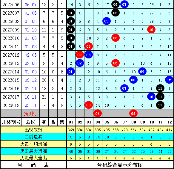 8、历史同时后区号码01发达最热,开出5次,号码07、08发达最冷,开出1次;