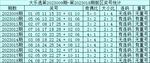 上期总结:体彩大乐透第23018期奖号开出:04 08 17 26 30+03 11,前区奖号奇偶比为1:4,012路比为1:1:3,大小比为2:3,莫得开出连码皇冠字符,莫得开出重号。